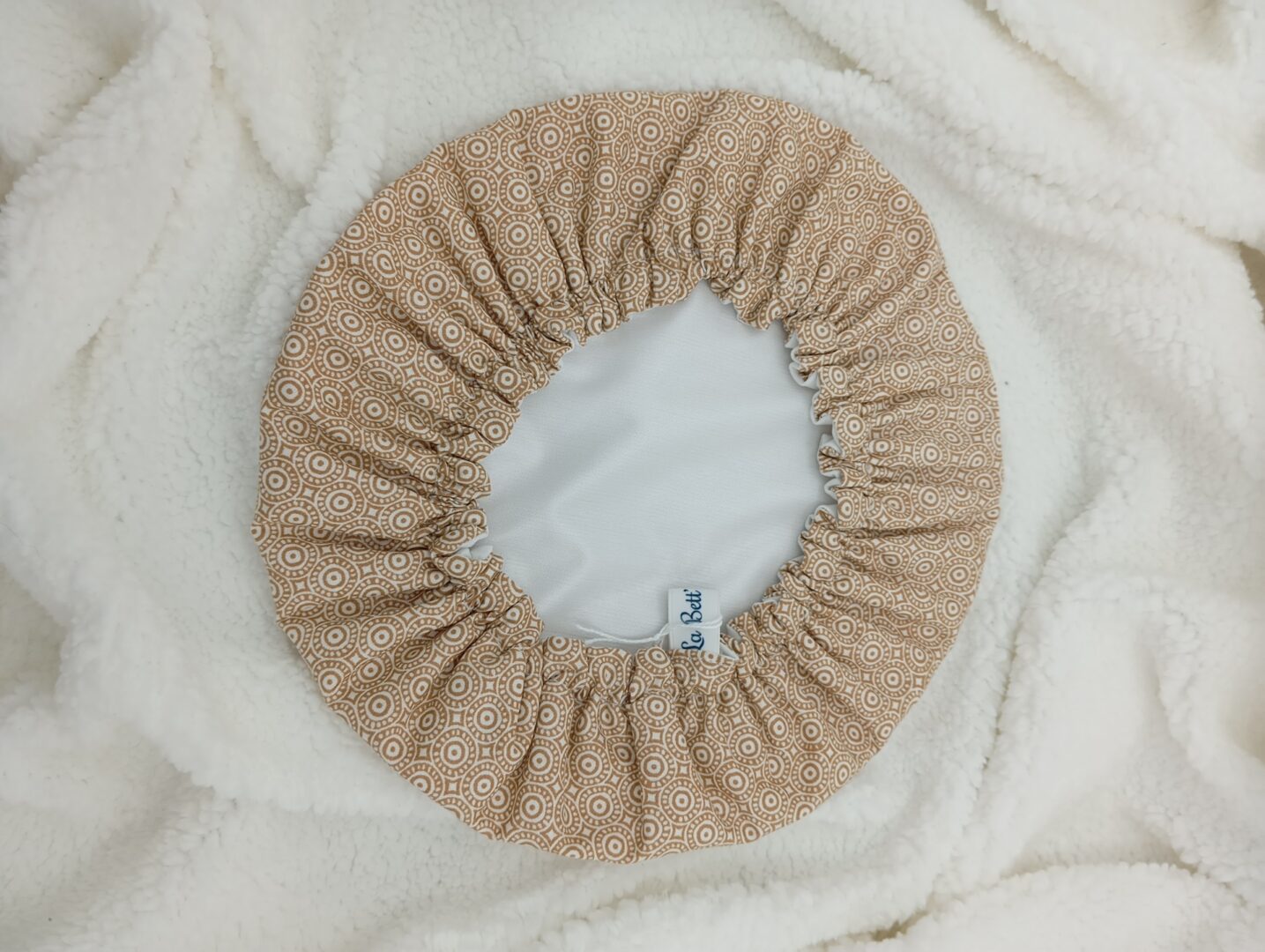 Elle est composée à l’intérieur d’un tissu imperméable, appelé PUL, qui est apte au contact alimentaire, et à l’extérieur d’un coton imprimé. Elle est élastiquée à la base pour un bon maintien. Lavable, elle est réutilisable à volonté.