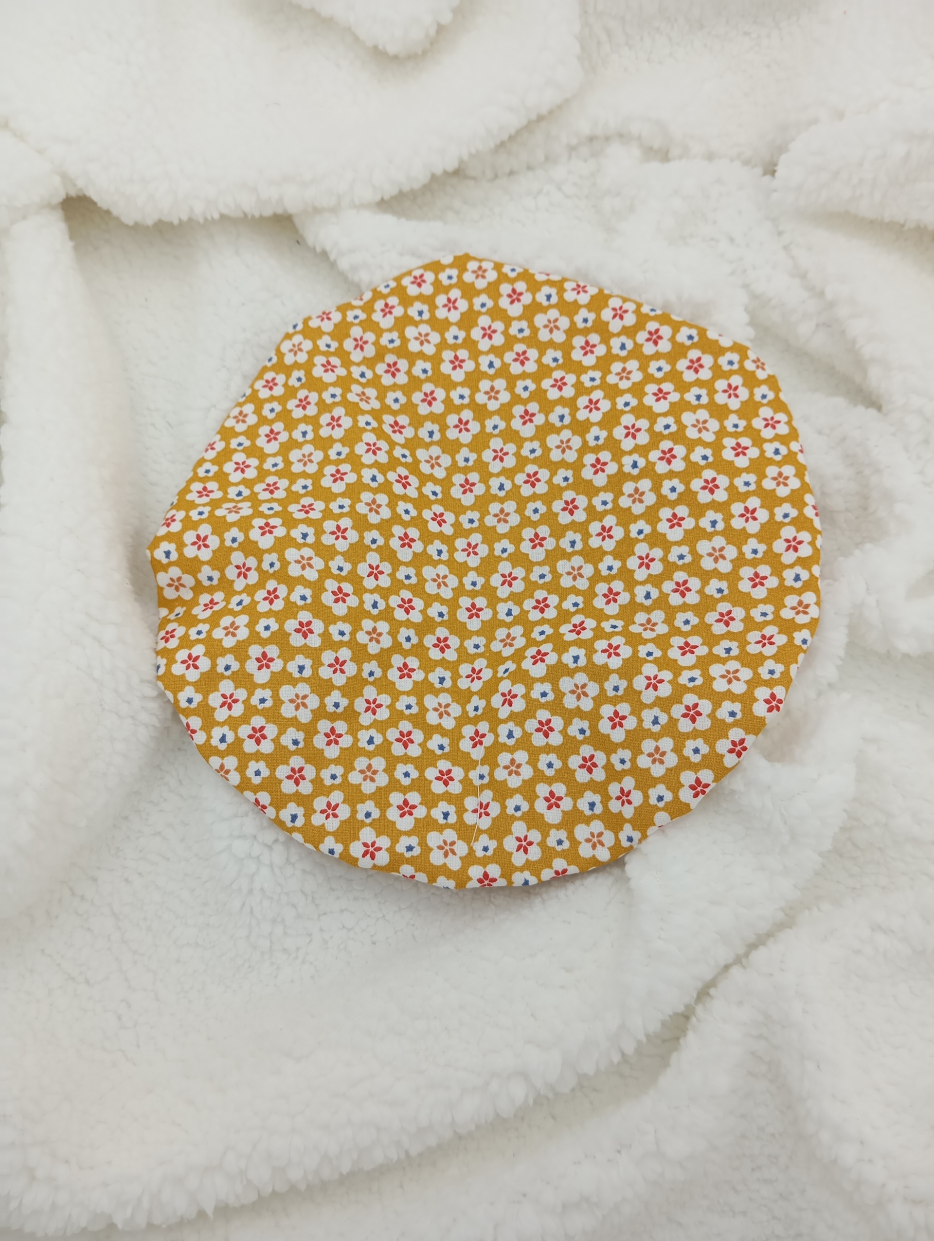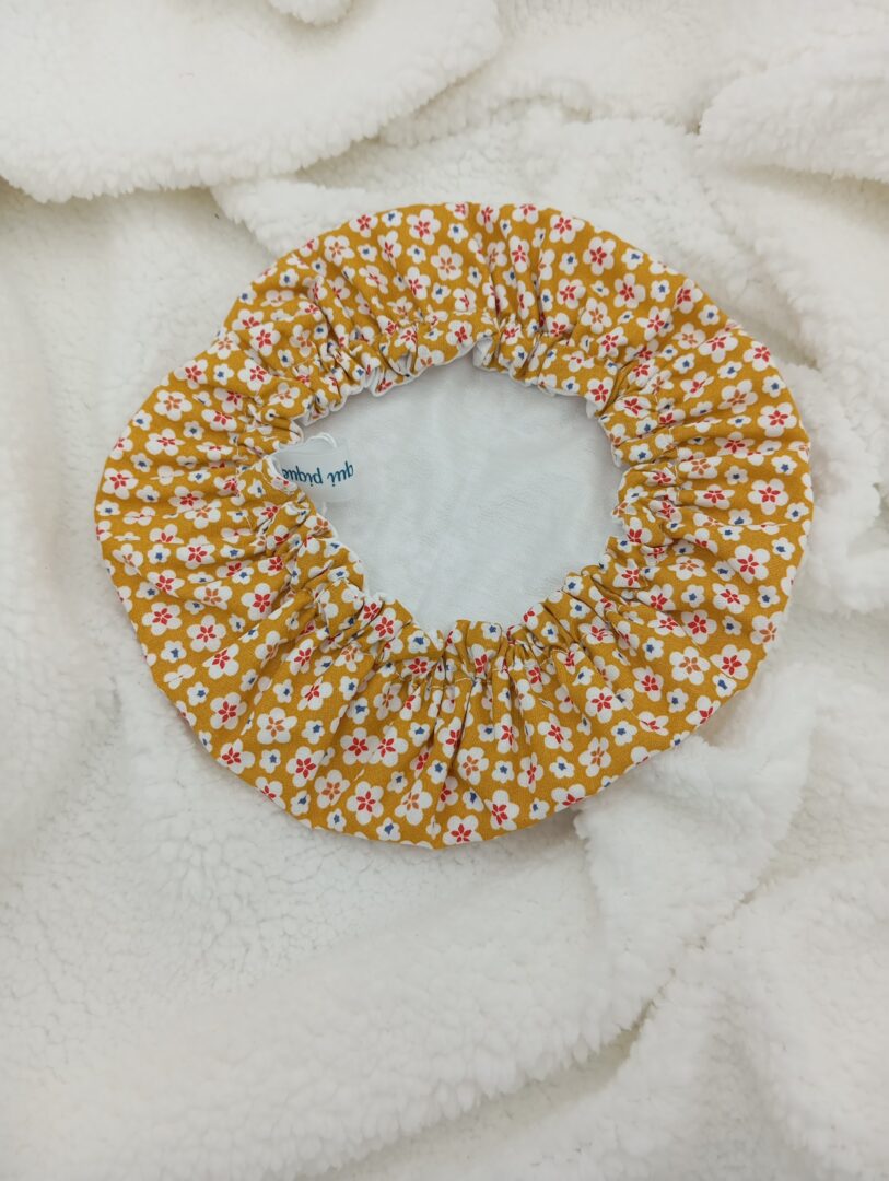 Elle est composée à l’intérieur d’un tissu imperméable, appelé PUL, qui est certifié contact alimentaire, et à l’extérieur d’un coton imprimé. Elle est élastiquée à la base pour un bon maintien. Lavable, elle est réutilisable à volonté.