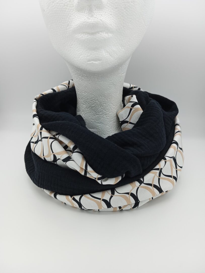 Ce tour de cou est composé de deux tissus, une viscose imprimée et une double gaze, matières douces et agréables. Il se porte en double tour.